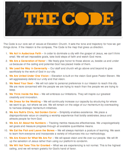 I have come across many vision and mission statements, but nothing like Elevation Church’s Code. Check this out:
