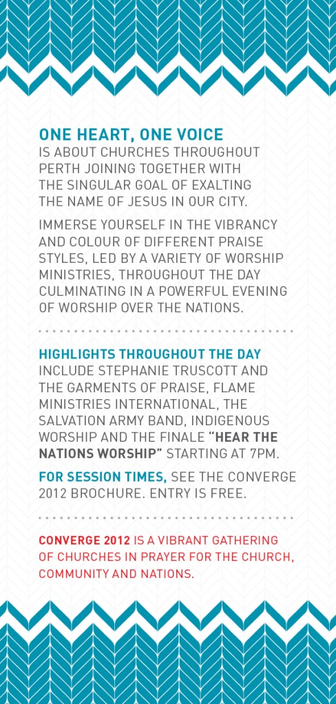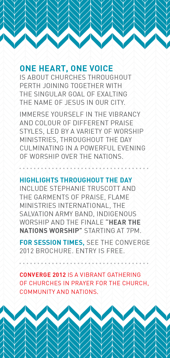 Posted on 25 Apr 201216 Jun 2012 by Lester Ong Check out the official flyer for One Heart, One Voice. If you are in Perth, bring your team, church, cell group, family and friends and join us in lifting up the Name of Jesus over our city and the nations! Share this: Click to share on Facebook (Opens in new window) Facebook Click to share on X (Opens in new window) X Click to email a link to a friend (Opens in new window) Email Click to print (Opens in new window) Print More Click to share on LinkedIn (Opens in new window) LinkedIn Click to share on Reddit (Opens in new window) Reddit Click to share on Tumblr (Opens in new window) Tumblr Click to share on WhatsApp (Opens in new window) WhatsApp Like Loading... Related