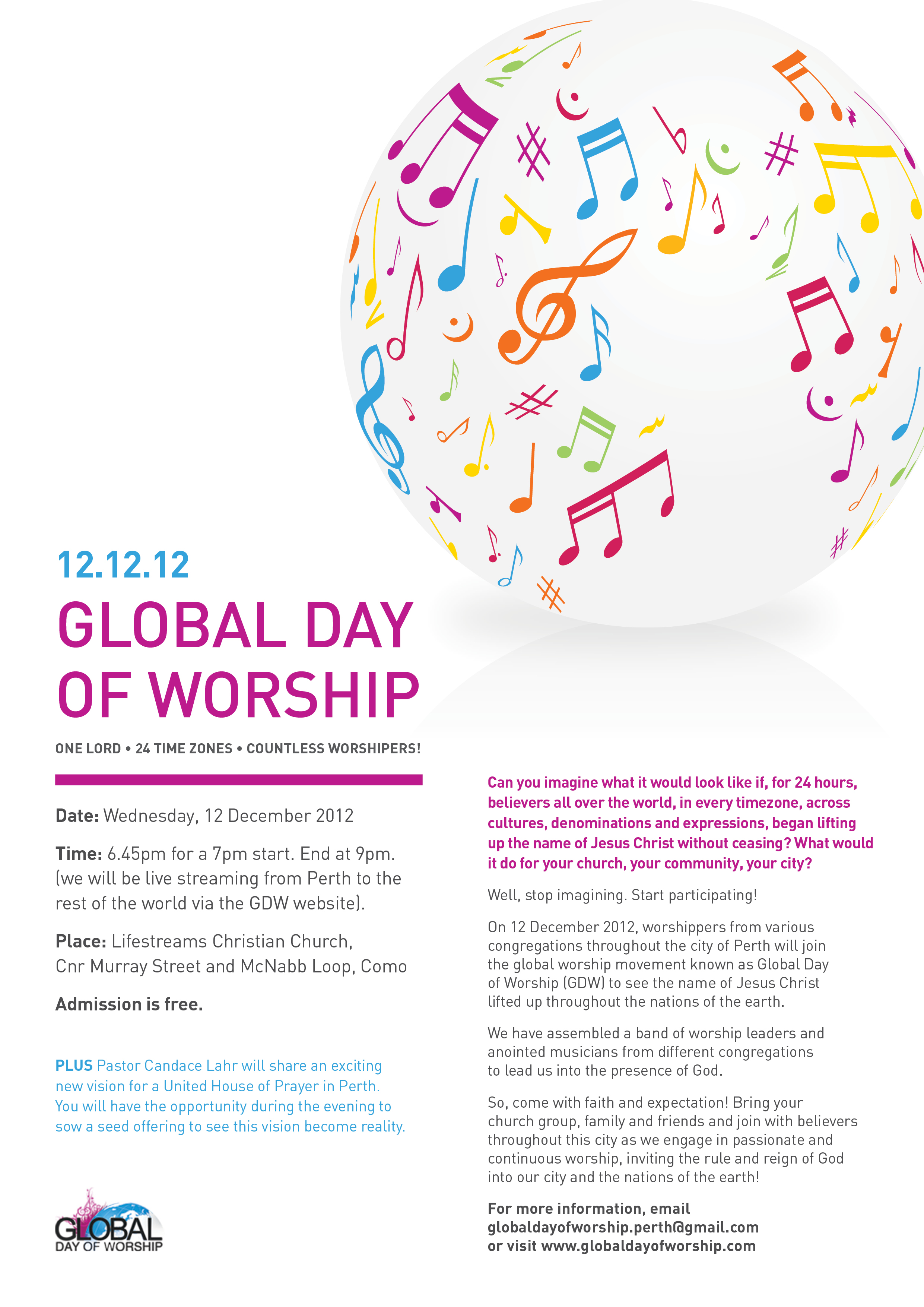 Well, we are now only weeks away from the Global Day of Worship on 12.12.12 and I’m glad to say that we’ve secured a great venue for GDW Perth and an awesome worship team of worship leaders, musicians and singers from different churches in the city.