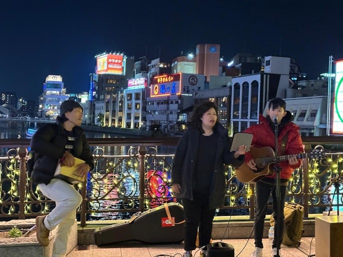 Later that evening, the team took to Canal City again for another round of busking. Kaylee was in full attractional force, and Sam took the opportunity to have conversations with more passers-by.